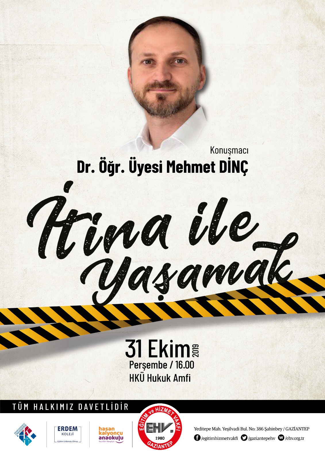 Vakfımızın ; 31 Ekim 2019 Perşembe günü saat ; 16 : 00’ da, Hasan Kalyoncu Üniversitesi Hukuk Amfi Salon’da, Sayın ; Hasan Kalyoncu Üniversitesi Öğretim Üyesi Dr.Mehmet DİNÇ’in katılımı ile düzenleyeceğimiz “İtina İle Yaşamak” konulu seminerimize, bütün halkımız davetlidir.