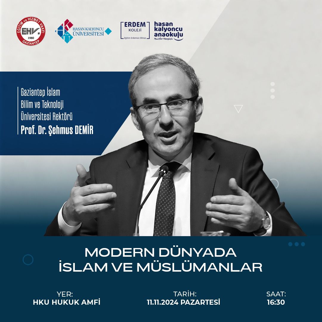 Vakfımızın geleneksel bursiyer buluşmaları kapsamında ; 11 Kasım 2024 Pazartesi günü saat ; 16 : 30’ da, Hasan Kalyoncu Üniversitesi, Hukuk Amfi’ de, Gaziantep İslam Bilim ve Teknoloji Üniversitesi Rektörü ; Prof. Dr. Sayın ; Şehmus DEMİR’ in katılımı ile düzenleyeceğimiz “Modern Dünyada İslam ve Müslümanlar” konulu konferansımıza, bütün halkımız davetlidir.