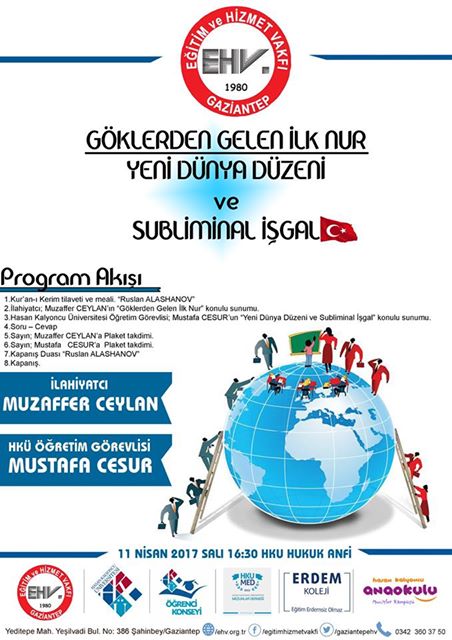 Vakfımızın;11 Nisan 2017 Salı günü saat;16:30’da,Hasan Kalyoncu Üniversitesi Kongre ve Kültür Merkezi2nde İlahiyatçı; Muzaffer CEYLAN ve Hasan Kalyoncu Üniversitesi Öğretim Görevlisi; Mustafa CESUR’un konuşmacı olarak katılımıyla düzenleyeceğimiz;”Göklerden Gelen İlk Nur” ve “Yeni Dünya Düzeni ve Subliminal İşgal”konulu seminerimize bütün halkımız davetlidir