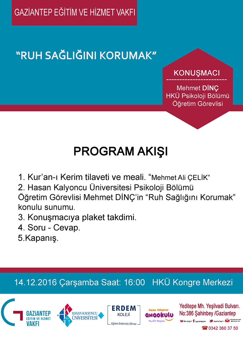 VAKFIMIZIN;14 ARALIK 2016 ÇARŞAMBA GÜNÜ SAAT:16:00'DA, HASAN KALYONCU ÜNİVERSİTESİ KONGRE MERKEZİ'NDE HKÜ PSİKOLOJİ BÖLÜMÜ ÖĞRETİM GÖREVLİSİ MEHMET DİNÇ'İN KONUŞMACI OLARAK KATILIMIYLA DÜZENLEYECEĞİMİZ "RUH SAĞLIĞINI KORUMAK" KONULU SEMİNERE BÜTÜN HALKIMIZ DAVETLİDİR.